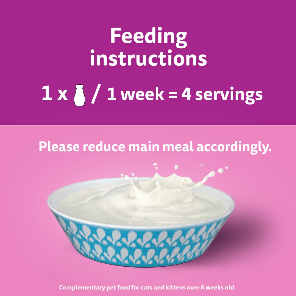 WHISKAS® Cat Milk has been developed with our nutritionists and veterinarians at The Waltham Centre for Pet Nutrition. Waltham is a leading authority on pet care and nutrition. WHISKAS® Cat Milk for kittens is specially made with reduced lactose so that it is better for cats. Unlike regular milk, this milk for cats has been developed to contain less than 0.1% lactose. Cats and kittens love the delicious taste of WHISKAS® Cat Milk and because it contains calcium, every lap is full of goodness. Show your cat you care with Cat Milk that is full of goodness and tastes great too.Whiskas Cat Milk is low in lactose (less than 0.1%) making it easier for your cat to digest than regular cow's milkCat milk and kitten milk with calcium to help support the development of strong bonesThis milk for cats is free from artificial colours, flavours and preservativesComplementary cat food with calcium and vitaminsWhiskas Cat Milk is suitable for kittens over 6 weeks of age and it contains calcium, known to support a kitten’s rapid development and help support the growth of healthy teeth and bonesIngredients
