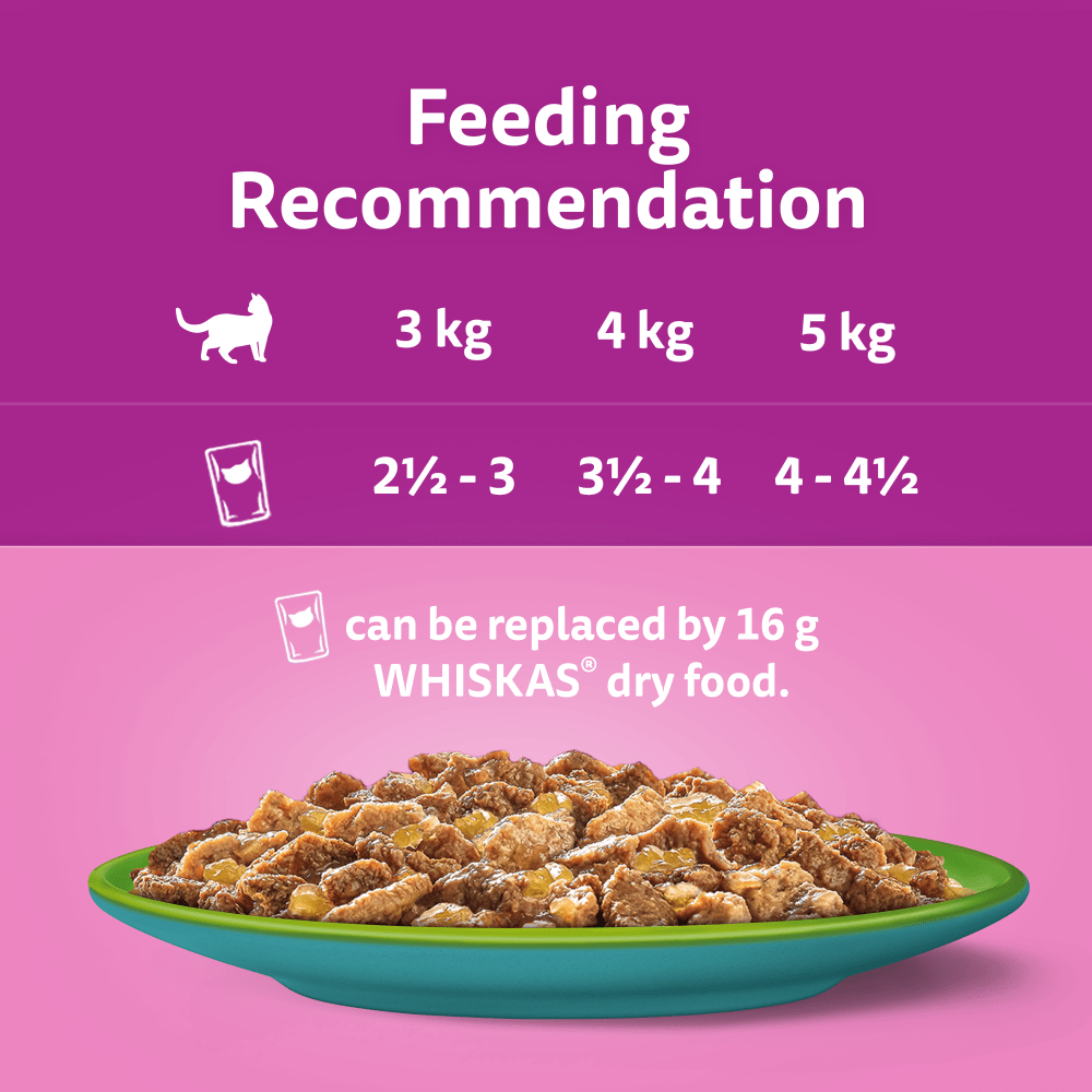 WHISKAS® 1+ Poultry Feasts adult cat food pouches in jelly are specially prepared to preserve the natural goodness and deliciousness of high quality ingredients and will see your cat rush to the bowl faster than ever before! Made with sustainably sourced ingredients, these cat food pouches contain everything your cat needs to keep them happy and healthy.Each delicious wet cat food recipe is made with 100% high quality ingredients and is formulated to provide 100% of your 1+ cat's daily needs.Cat food pouches with high quality protein to support strong muscles.Adult cat food formulated with Vitamin C to help support natural defences.Cat food containing zinc, essential for a healthy skin & coat.We are committed to reducing our environmental impact. 85% of our factories in Europe use renewable electricity and we’re working to move to 100% by 2025.Ingredients