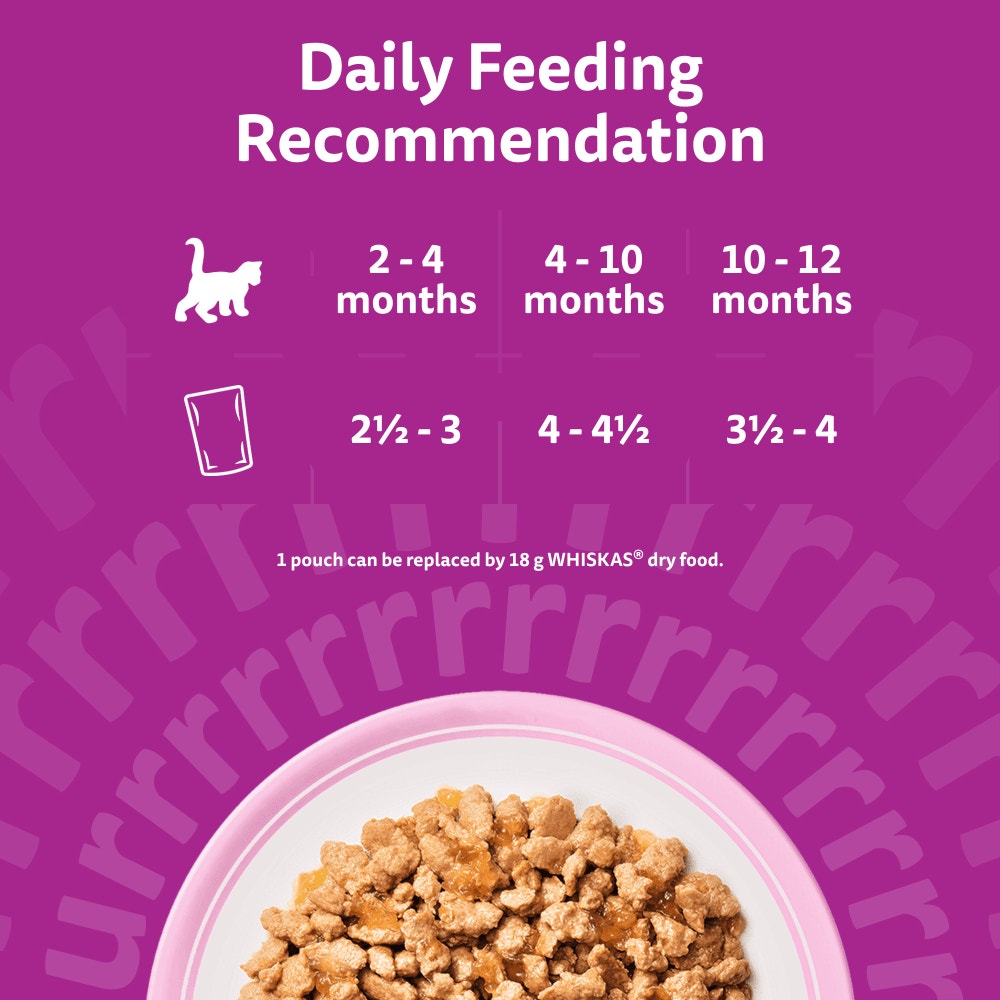 Specially prepared to preserve the natural goodness and deliciousness of high quality ingredients, our tasty recipes are designed for contented purrs at mealtimes…and beyond. Each meal is lovingly crafted to contain everything your little friend needs to grow up happy and healthy.100% high quality ingredients and specially formulated to provide all of your kittens daily needs.Mouth-watering flavours in smaller chunks to help grow little purrs into big ones.Designed for little mouths & sensitive tummies90% of the protein comes from animal sourcesNo added artificial colours and preservatives.Ingredients